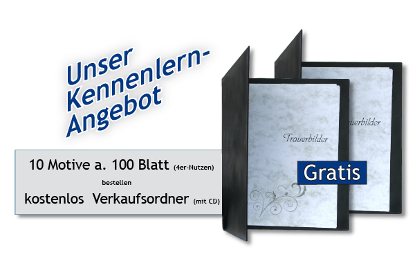 1er-Nutzen Sie sind hier: Shop > Trauerbilder > 1er-Nutzen Präsentationsordner, Aktion 10 Motive + 2 Ordner kostenlos Art. Nr.: TB-Ordner (Offline) Beschreibung Kennenlernangebot der Titus Trauerbilder:Ab einer Bestellmenge von 10 Motiven (4-er Nutzen) erhalten Sie kostenlos zwei Präsentationsmappen und eine wertvolle CD mit Gestaltungsvorlagen für Ihren Trauerdruck.Nutzen Sie die Aktion für Ihre professionelle Trauerbild Präsentation. Bestellen Sie 10 Motive und diese beiden Ordner kostenlos dazu!Sie können in der Bestellung auswählen wieviele Bilder Sie im Ordner zeigen möchten. 16, 20, 24 oder bis zu 60 Bildern. Zurück